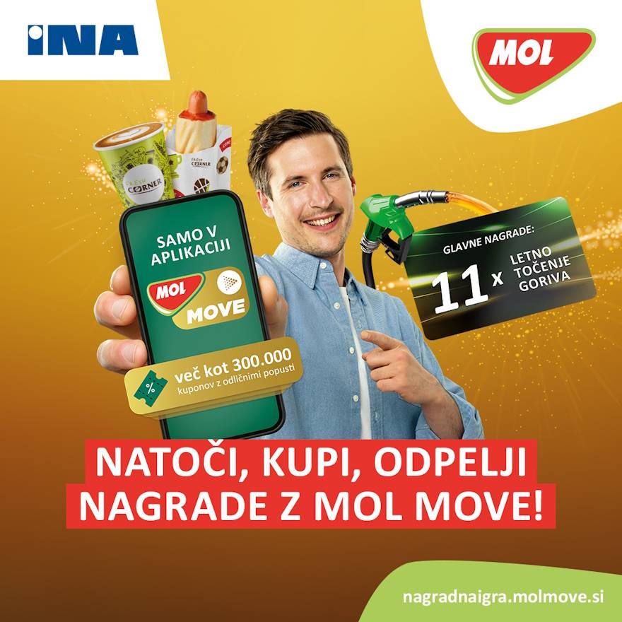 V aplikaciji MOL Move se prijavite v nagradno igro in s skoraj vsakim nakupom na servisu ste uvrščeni v žrebanje. Zraven tega, da bodo pri MOL-u 11 strank nagradili s celoletnim brezplačnim točenjem EVO goriva, bodo tedensko podelili še številne druge mamljive nagrade, med sodelujoče pa razdelili več kot 300.000 kuponov presenečenja.