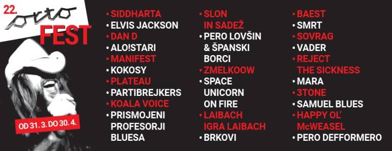 Otvoritveni koncert 30. marca, bo pripadel sloviti domači zasedbi Siddharta, že dan po tem, 31. marca, pa bo nastopila skupina Elvis Jackson. Prvega aprila boste lahko na odru videli tudi skupino Dan D, šestega aprila pa sledi nastop domačih skupin Alo!Stari in Manifest.