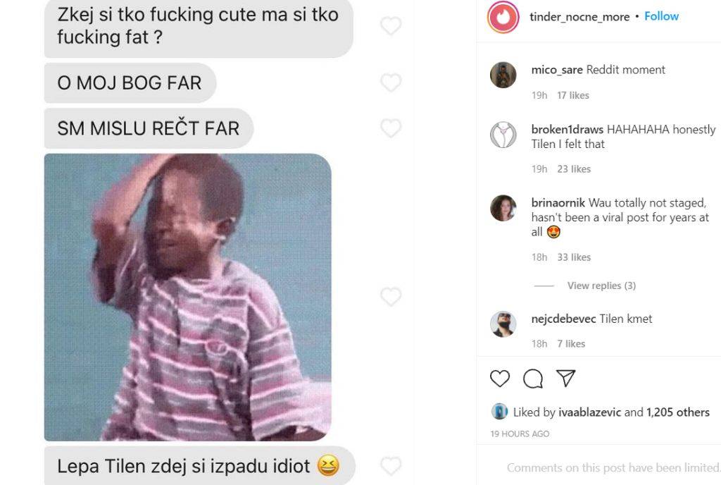Za vse, ki svojo boljšo polovico še iščete, bo zadetek v polno zagotovo profil TNM - Tinder Nočne More. Če se boste s preveč situacijami poistovetili, pa zna biti spremljanje profila grenko-sladka izkušnja.