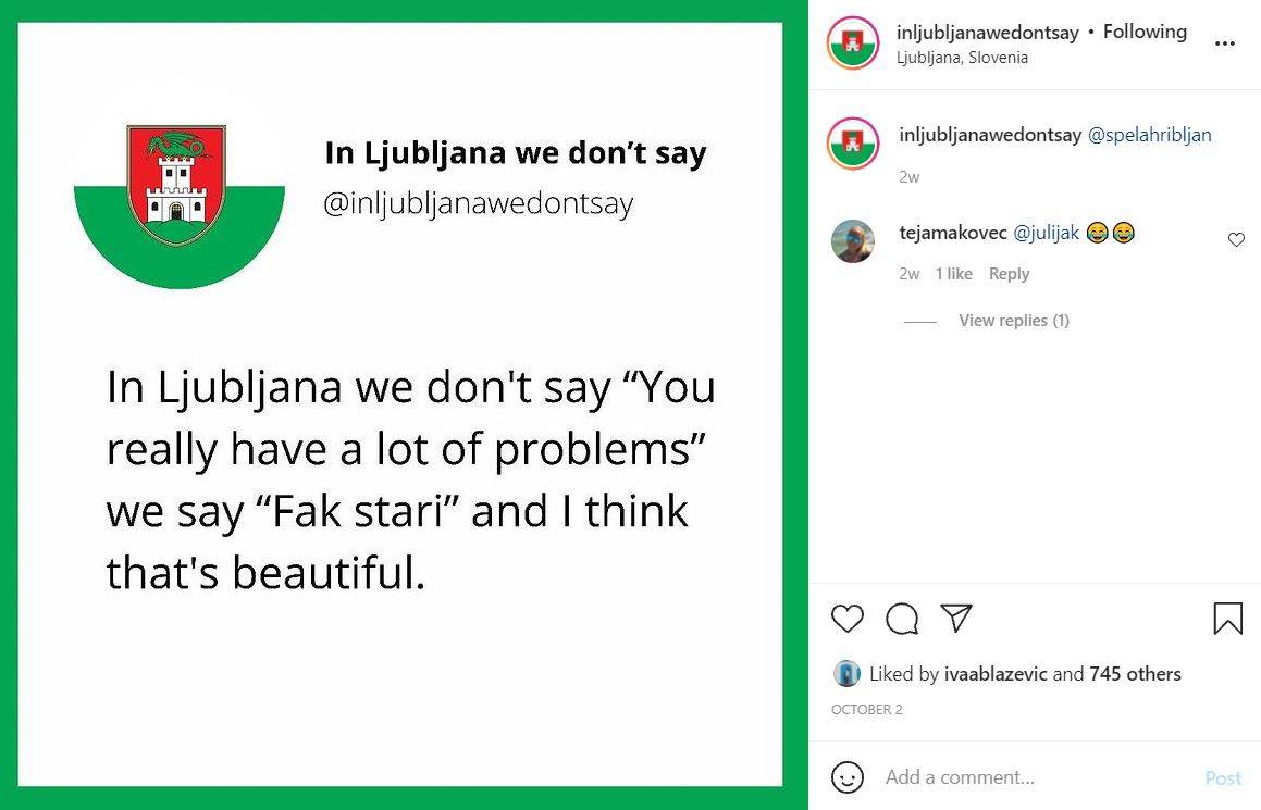 Gre za profil, ki izpostavlja besedne zveze ali nenavadne skovanke, tipične za Ljubljančane. In zadnje čase jim izjemno dobro uspeva, saj praktično z vsako objavo zadenejo žebljico na glavico.