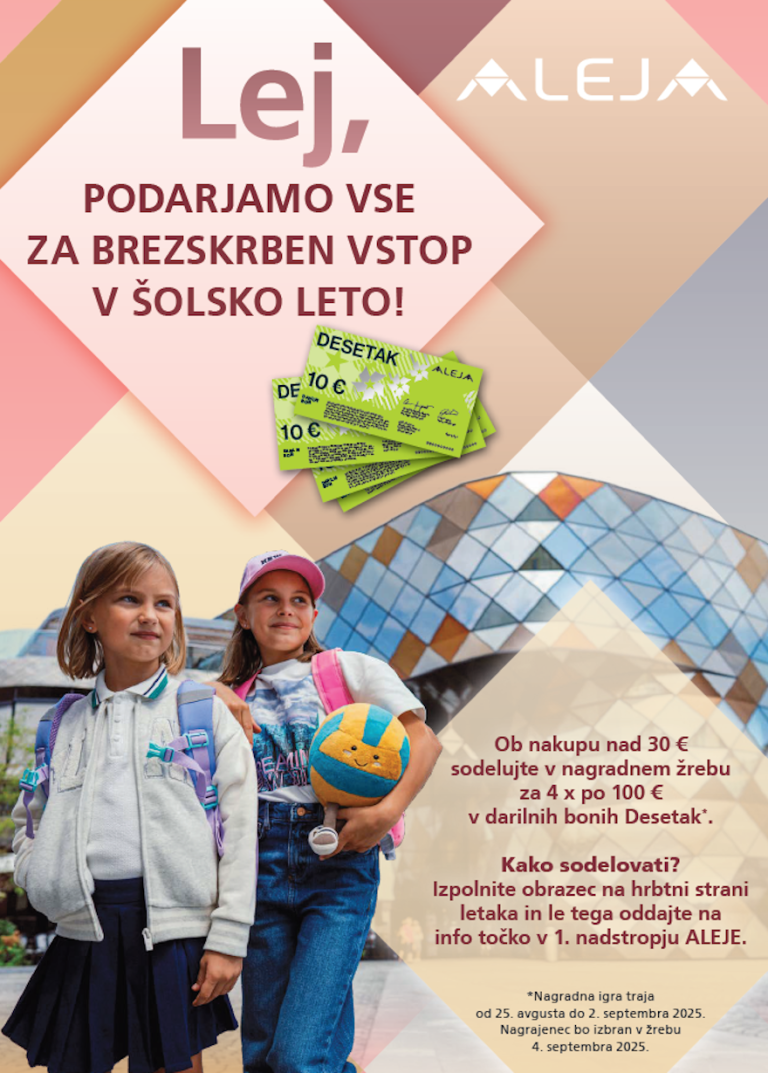 Ne spreglejte pa tudi bogate nagradne igre »Lej, podarjamo vse za brezskrben vstop v šolsko leto!«, v kateri bodo podelili 400 evrov v darilnih bonih DESETAK, v vrednostih štirikrat 100 evrov.