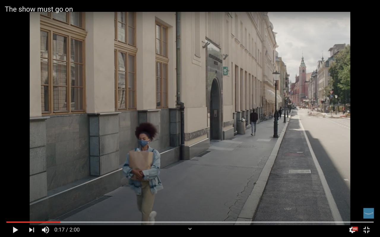 Amazon je v svoj oglas vpletel tudi trenutne razmere zaradi širjenja covida-19. V oglasu namreč spremljamo mlado balerino, ki ji načrte prekriža pandemija. Njeni nastopi in treningi so odpovedani, a deklica se ne vda in nadaljuje s plesanjem, podpira jo tudi njena družina in domače okolje, da zvečer zapleše na zasneženi ploščadi med bloki. Na koncu se prikaže zapis The show must go on (šov se mora nadaljevati), s čimer želi Amazon sporočiti, da se mora naše življenje kljub pandemiji nadaljevati.