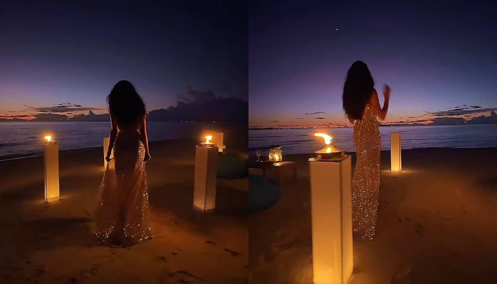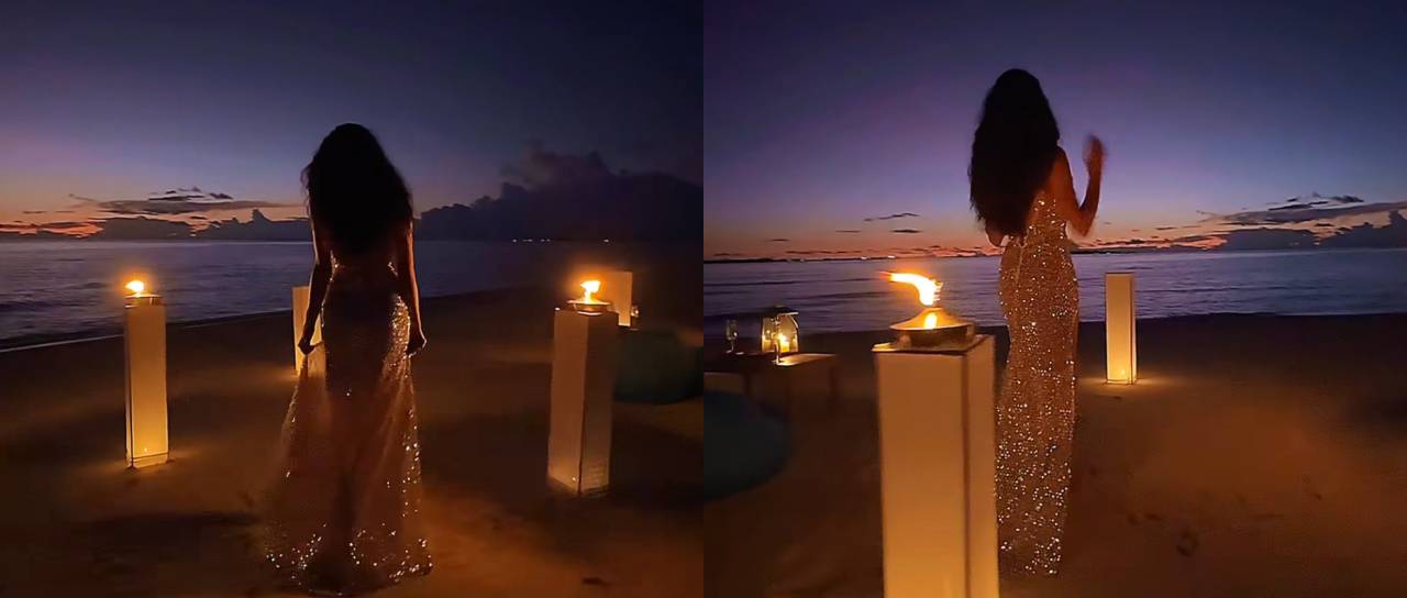 V videu se Tina sprehaja po plaži ob mraku, oblečena v svetlikajočo obleko z visokim razporkom.