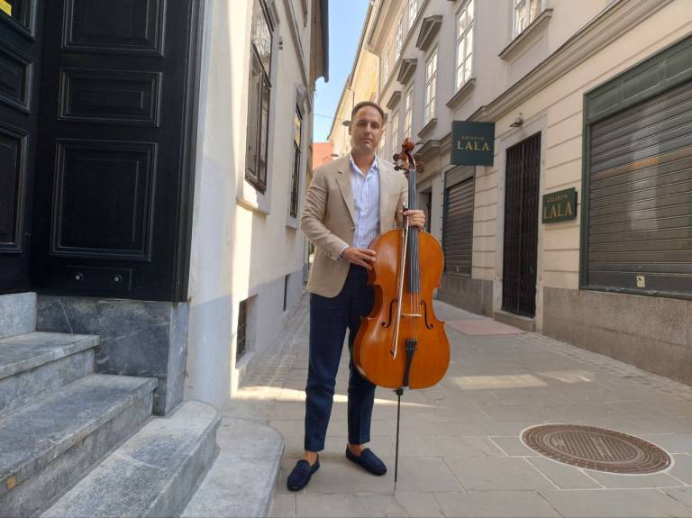 Dobila sva se zgodaj zjutraj v centru Ljubljane, s seboj je prinesel velik kovček z violončelom in naročil gazirano vodo z limono.