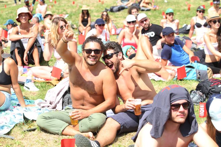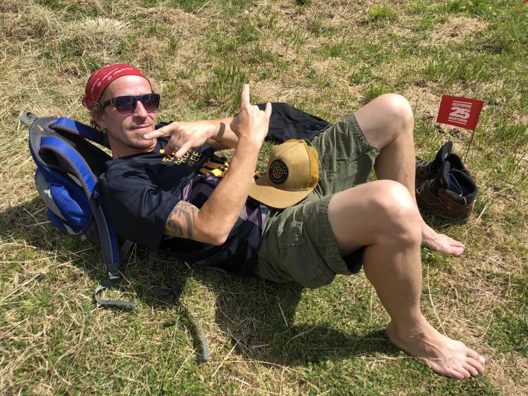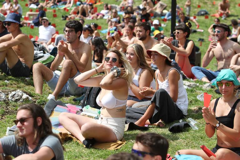 Vstop je bil možen samo z masko, vsakemu obiskovalcu so na vhodu izmeri temperaturo. Po travniku, ki se je razprostiral pred odrom, so bile zataknjene zastavice, ki so določale varno razdaljo med prostorom za publiko - če ste prišli v družbi, ste vsi lahko sedeli na istem mestu. Občutek je bil kot na plaži ob prvem poletnem dnevu. Prijatelji so si mahali, hodili do šanka po pijačo, nasmeški so bili povsod, eni so čvekali, drugi so se sončili, tretji delali selfije in fotografirali osupljivo naravno kuliso okrog in okrog prizorišča.
