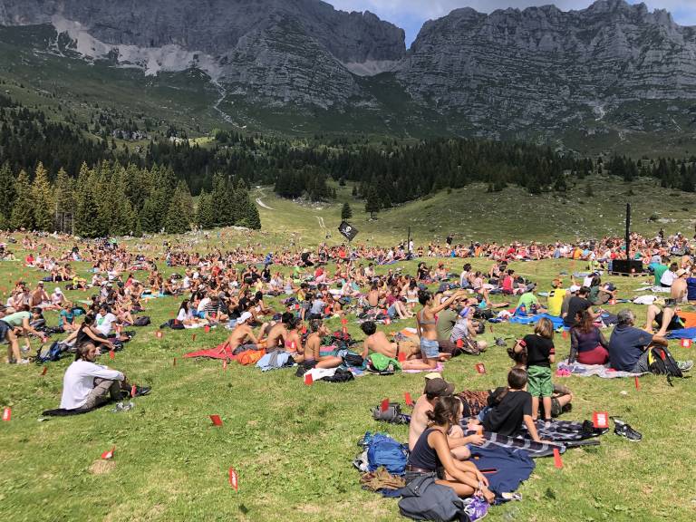 Koncert je dejansko bil koncept: do prizorišča ni možno dostopati brez avta. Po vijugaati cesti ste se lahko od Sella Nevea odpravili z biciklom ali peš, druga pot je vodila po gorskih poteh in po slednji smo se podali tudi sami. Alpe, ki so se v vsej bihotnosti dvigovale proti nebu iz vseh smeri, so po petih kilometrih razkrile prizorišče pri majhnem hotelu sredi planote.