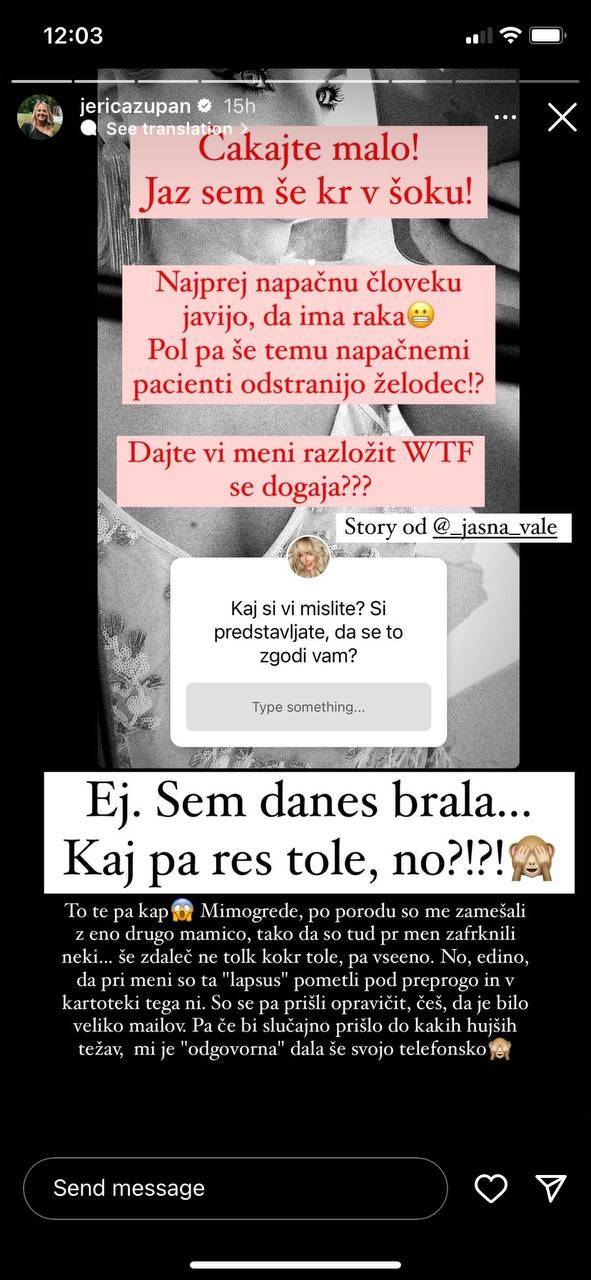 »Mimogrede, po porodu so me zamešali z eno drugo mamico, tako da so tudi pri meni zafrknili nekaj … Še zdaleč ne tako, kakor tole, pa vseeno. No, edino, da pri meni so ta »lapsus« pometli pod preprogo in v kartoteki tega ni. So se pa prišli opravičit, češ, da je bilo veliko mailov. Pa če bi slučajno prišlo do kakšnih hujših težav, mi je »odgovorna« dala še svojo telefonsko.«