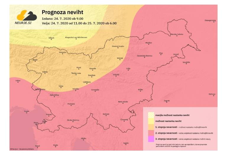 "Glede na nekatere meteorološke modele lahko zlasti na vzhodu države lokalno pade več kot 100 mm dežja, kar bi povzročilo lokalne hudourniške poplave. Zvečer bo zapihal severni veter. Močnejše padavine se bodo predvsem na vzhodu države predvidoma nadaljevale tudi v noči na soboto. V soboto zjutraj bodo padavine slabele in dopoldne po večini države ponehale, še bo pihal severni veter, na Primorskem prehodno šibka burja," navaja portal Neurje.si