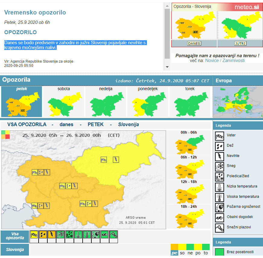 ARSO opozarja, da se bodo danes predvsem v zahodni in južni Sloveniji pojavljale nevihte s krajevno močnejšimi nalivi. V kratkem času bo padla velika količina padavin, zato so razglasili oranžni alarm.