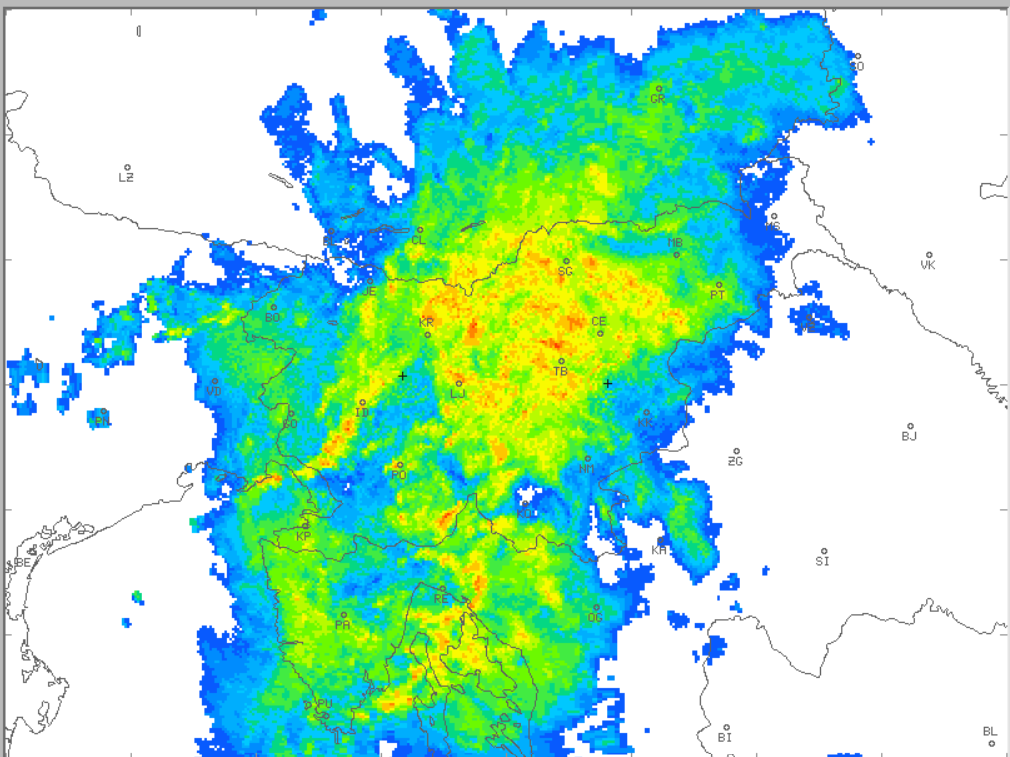 Ponoči so padavine že zajele večji del države, nastajajo tudi nevihte z nalivi. V jutranjih urah se bo močnejši dež razširil nad vso Slovenijo. Danes čez dan bo v višinah z močnimi jugozahodnimi vetrovi že pritekal hladnejši zrak, pri tleh pa bo še razmeroma toplo. Ozračje bo vse bolj nestabilno, vreme bo zelo spremenljivo, nastajale bodo krajevne plohe in nevihte z nalivi, ki bodo pogostejši na zahodu in jugu.
