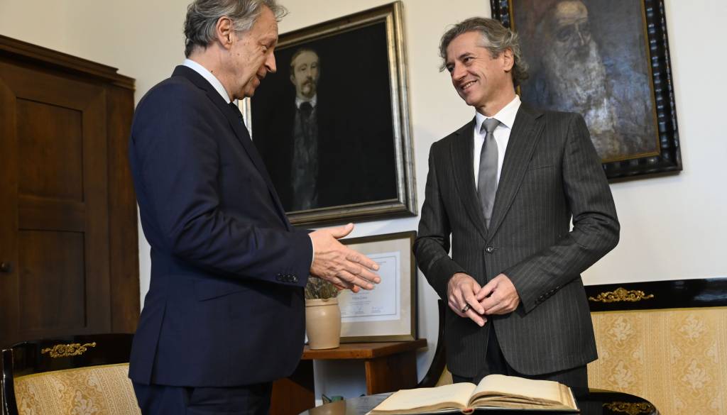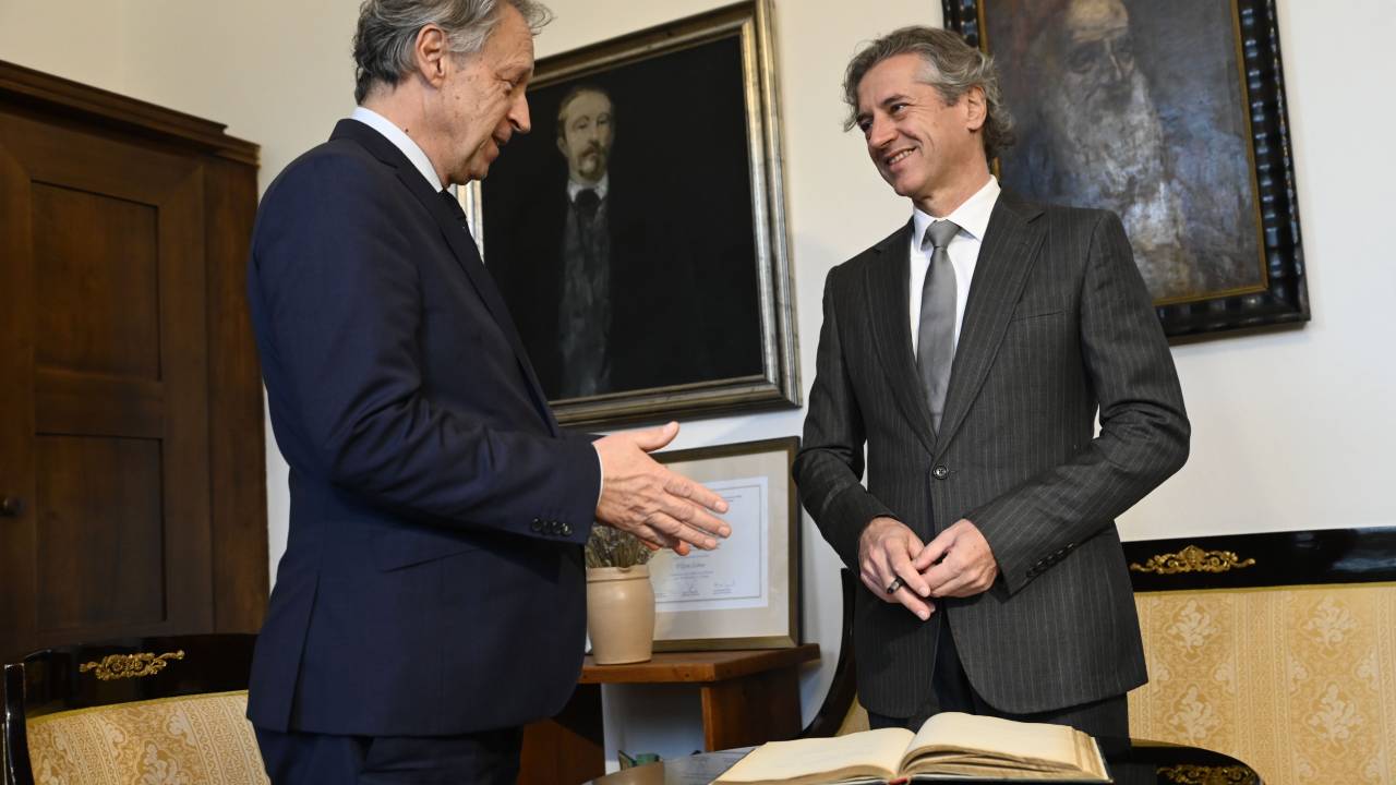 Predsednik vlade Robert Golob je danes obiskal stavbo Narodne in univerzitetne knjižnice, kjer je z ravnateljem knjižnice Viljemom Lebanom spregovoril o načrtih vlade glede gradnje NUK 2.