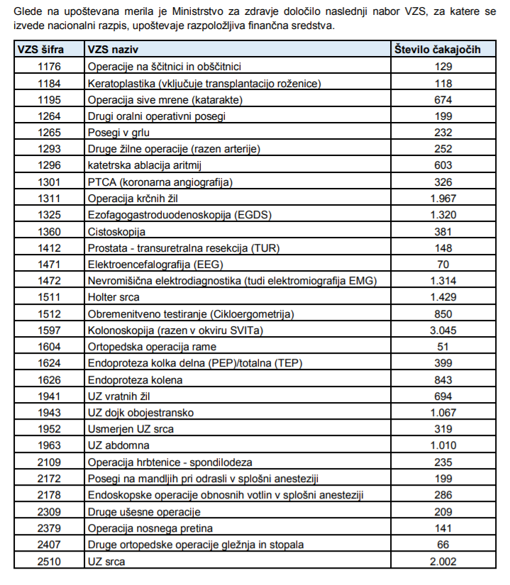 Za izvedbo javnega razpisa in skrajševanje števila čakajočih pacientov nad dopustno dobo se namenja 65 milijonov evrov. To finančno injekcijo je ministrstvo zagotovilo iz sredstev za dopolnilno zdravstveno zavarovanje in iz proračuna za zavarovance, ki dopolnilnega zavarovanja nimajo. Po besedah državnega sekretarja Cuglja bo v sklopu nacionalnega razpisa obravnavanih več kot 20.000 pacientov.