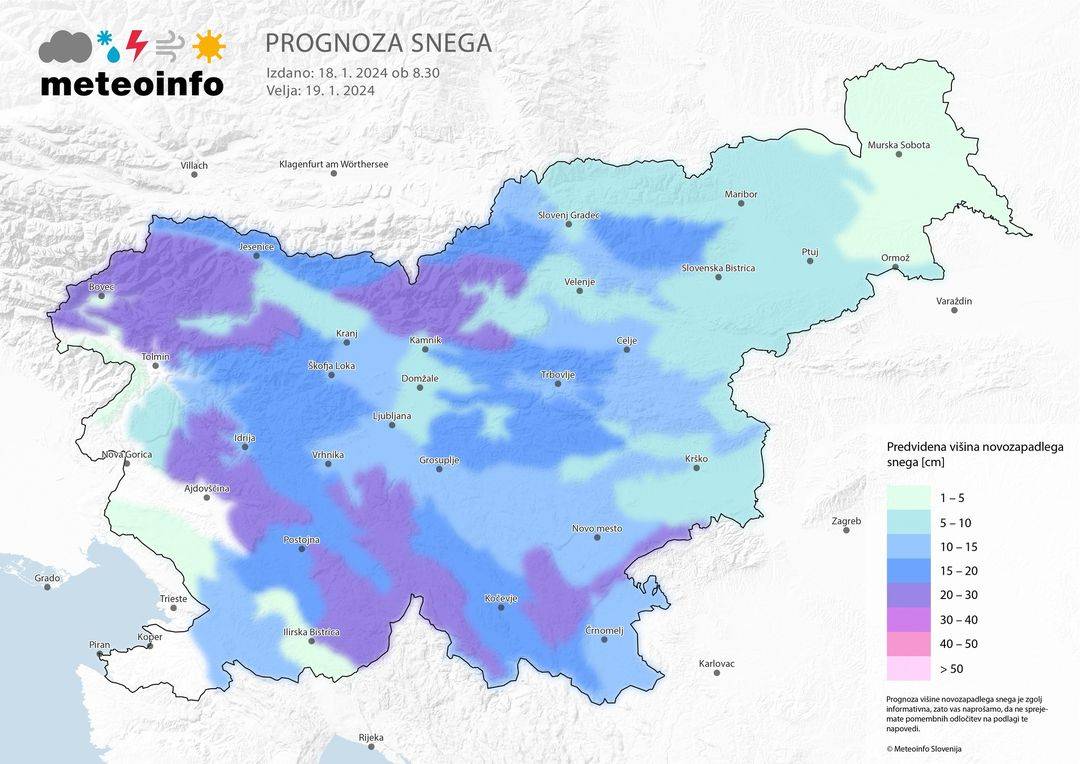 Po nižinah osrednje Slovenije lahko v petek dopoldne v manj kot šestih urah zapade večinoma od pet do deset centimetrov snega, nad nadmorsko višino okoli 500 metrov pa tudi okoli 15 centimetrov.