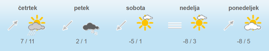»Razmeroma hladno bo tudi še v ponedeljek, nato pa bo k nam ponovno dotekal občutno toplejši zrak in sneg bo v večjem delu Slovenije pobralo. Sredi tedna lahko temperature ponekod spet presežejo deset stopinj Celzija,« so zapisali na portalu Meteoinfo Slovenija.
