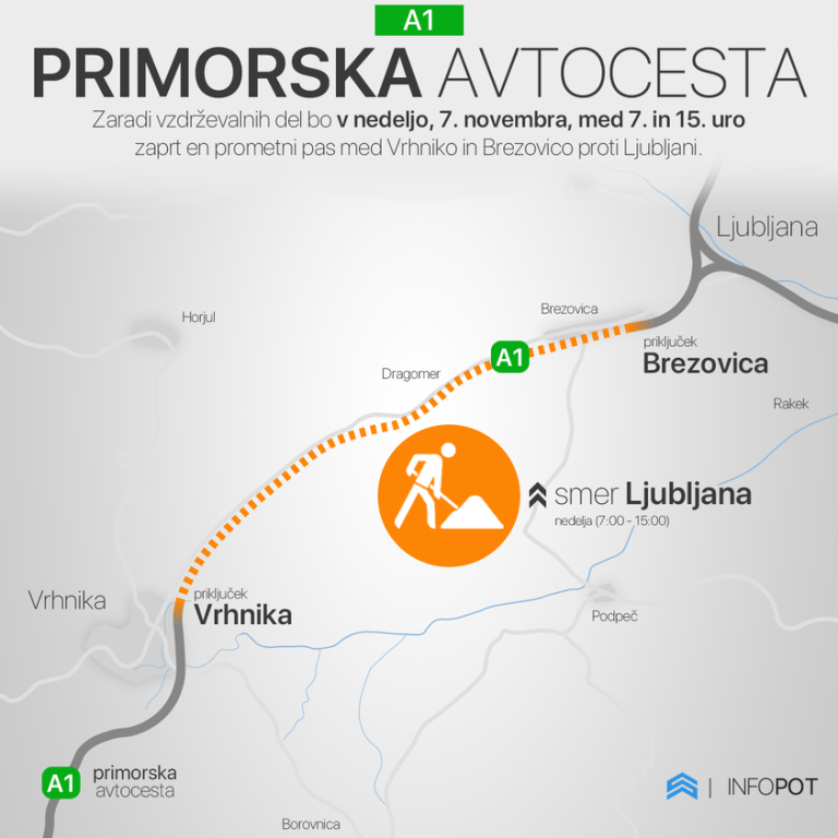 Infopot poroča, da bo zaradi vzdrževalnih del bo v nedeljo, 7. novembra, med 7. in 15. uro zaprt en prometni pas med Vrhniko in Brezovico proti Ljubljani.