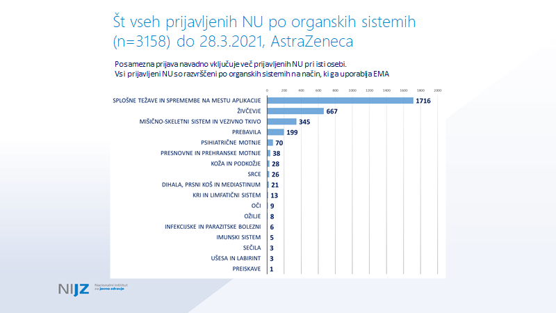 Od začetka cepljenja do vključno 28. marca so na Nacionalnem inštitutu za javno zdravje prejeli 25 prijav resnih neželenih dogodkov po cepljenju s cepivom Pfizer, eno prijavo po cepljenju s cepivom Moderna in deset prijav po cepljenju s cepivom AstraZeneca.