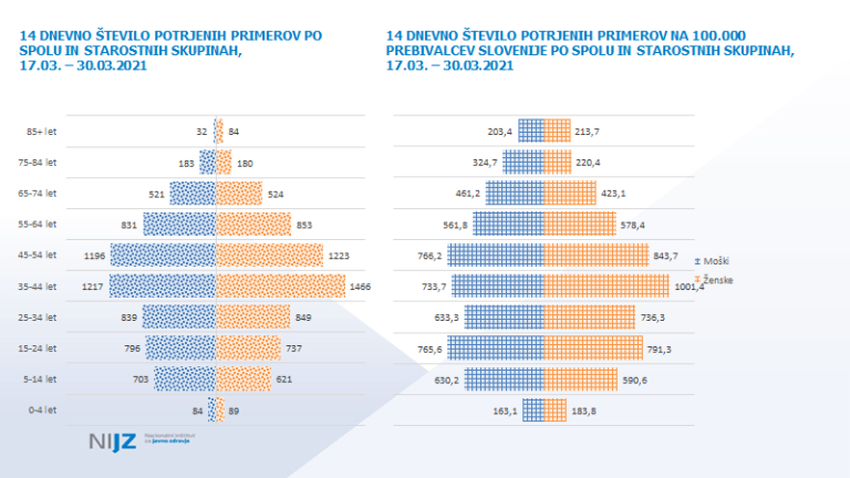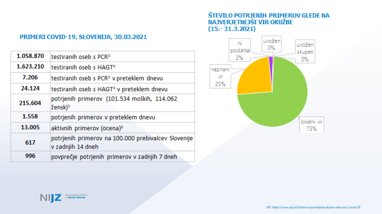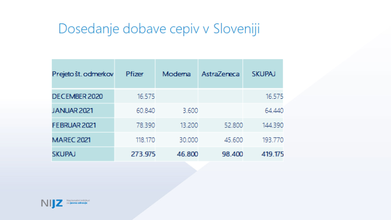 V Sloveniji smo do danes prejeli več kot 400.000 odmerkov cepiv proti covid-19. Število dobavljenih cepiv počasi narašča, več jih pričakujemo v aprilu. Cepljenih je dobrih 11 odstotkov prebivalcev, delež okuženih pa narašča predvsem med mladimi.