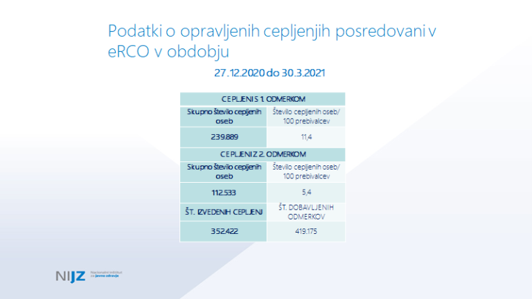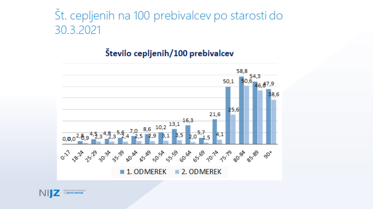 Od začetka cepljenja do 30. marca je bilo cepljenih skoraj 240 tisoč oseb, oziroma 11,4 odstotkov prebivalcev, z drugim odmerkom pa 5,4 odstotkov.