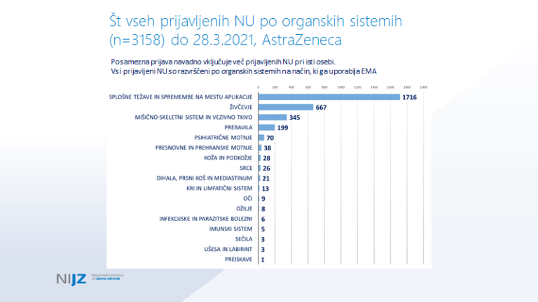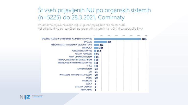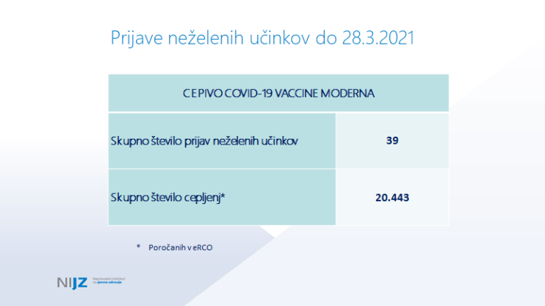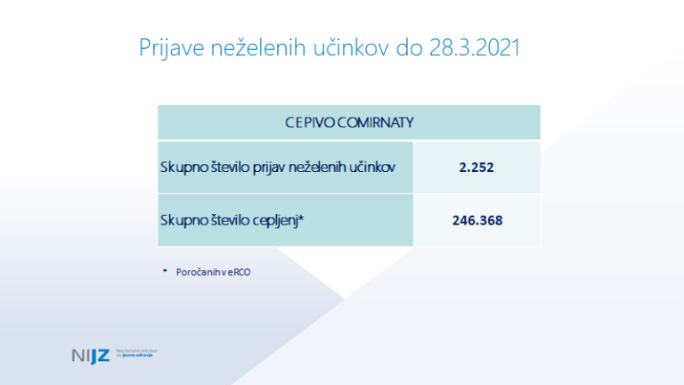 Od začetka cepljenja do vključno 28. marca so na Nacionalnem inštitutu za javno zdravje prejeli 25 prijav resnih neželenih dogodkov po cepljenju s cepivom Pfizer, eno prijavo po cepljenju s cepivom Moderna in deset prijav po cepljenju s cepivom AstraZeneca.