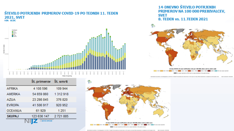 Namestnica predstojnika Centra za nalezljive bolezni na Nacionalnega inštituta za javno zdravje Nuška Čakš Jager je povedala, da v svetu in Evropi raste število okužb. Skupaj je bilo potrjenih že več kot 123 milijonov primerov in več kot 2,7 milijona smrti.