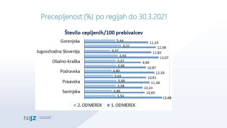 Razlike v precepljenosti med regijami niso velike, povprečno je precepljenost po regijah 11 odstotna. S prvim odmerkom se je v Podravski regiji cepilo 12,33 odstotkov prebivalcev, 4,8 jih je prejelo oba odmerka cepiva.