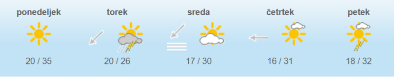 Jutranje temperature bodo od 16 do 23, najvišje dnevne od 23 do 28, na Primorskem in jugovzhodu do 32 stopinj Celzija. V Ljubljani bo okoli 23 stopinj.