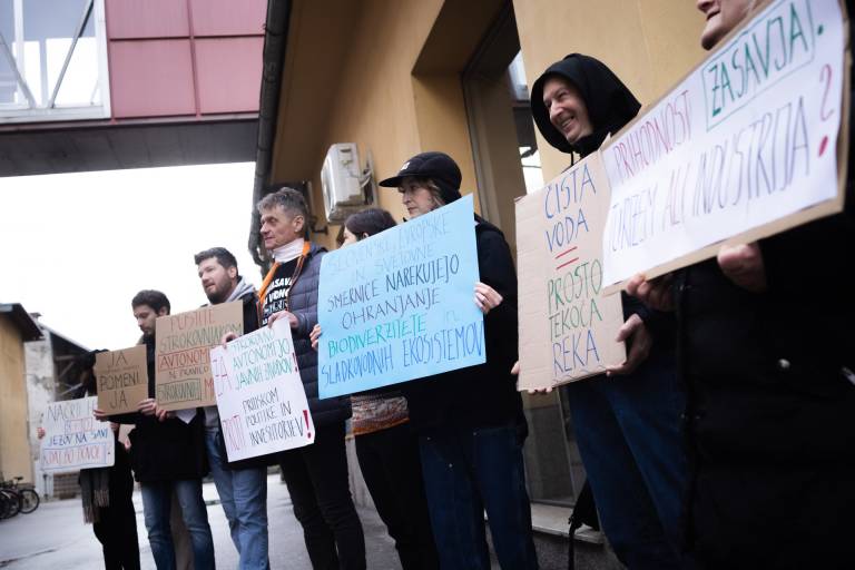 Pred stavbo Zavoda Republike Slovenije za varstvo narave v Ljubljani zbrali nevladniki, da bi opozorili na problematiko strokovne neavtonomije javnih zavodov, še posebej zavoda za varstvo narave.