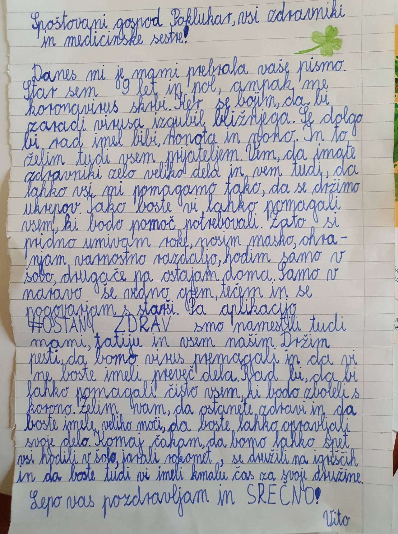 Vito je pismo napisal po tem, ko mu je mama prebrala javno pismo, ki ga je pred nekaj dnevi generalni direktor UKC Ljubljana Janez Poklukar namenil vsem prebivalcem Slovenije.