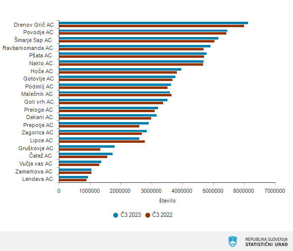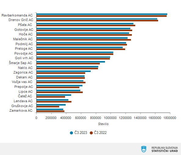 Statistični urad Republike Slovenije je največ tovornega prometa našetl pri Ravbarkomandi. Največ potniških vozil je v lanskem tretjem četrtletju zaznal števec Drenov Grič, in sicer so našteli 6,1 milijonov vozil, najmanj pa števec Lendava z le enim milijonom.