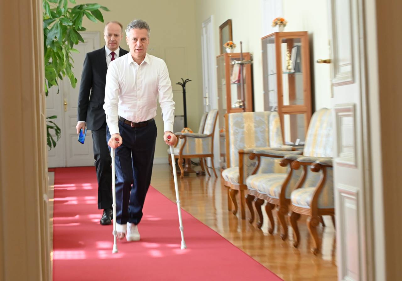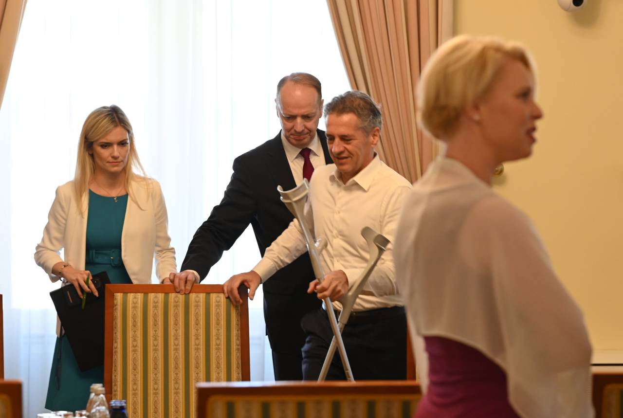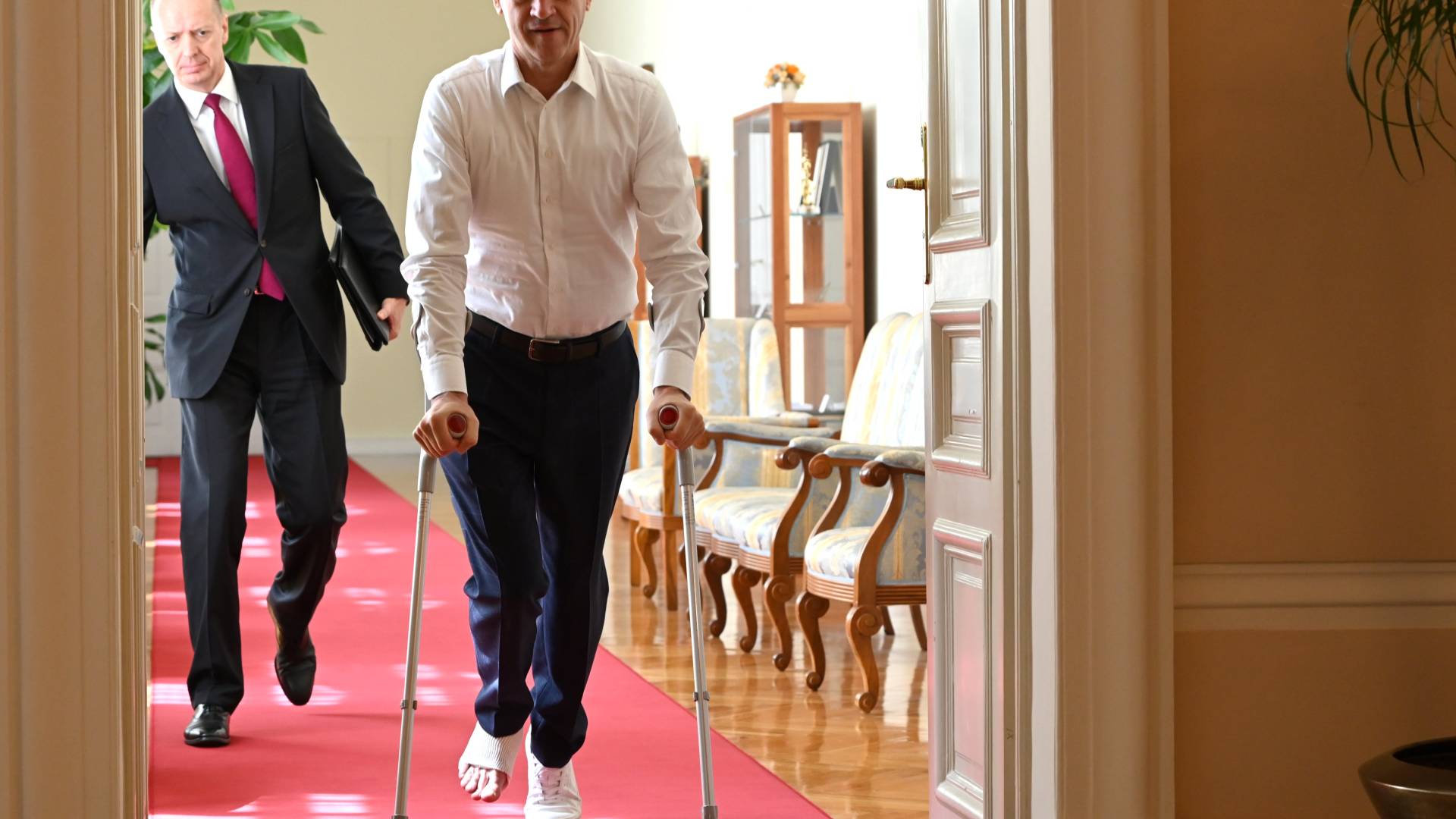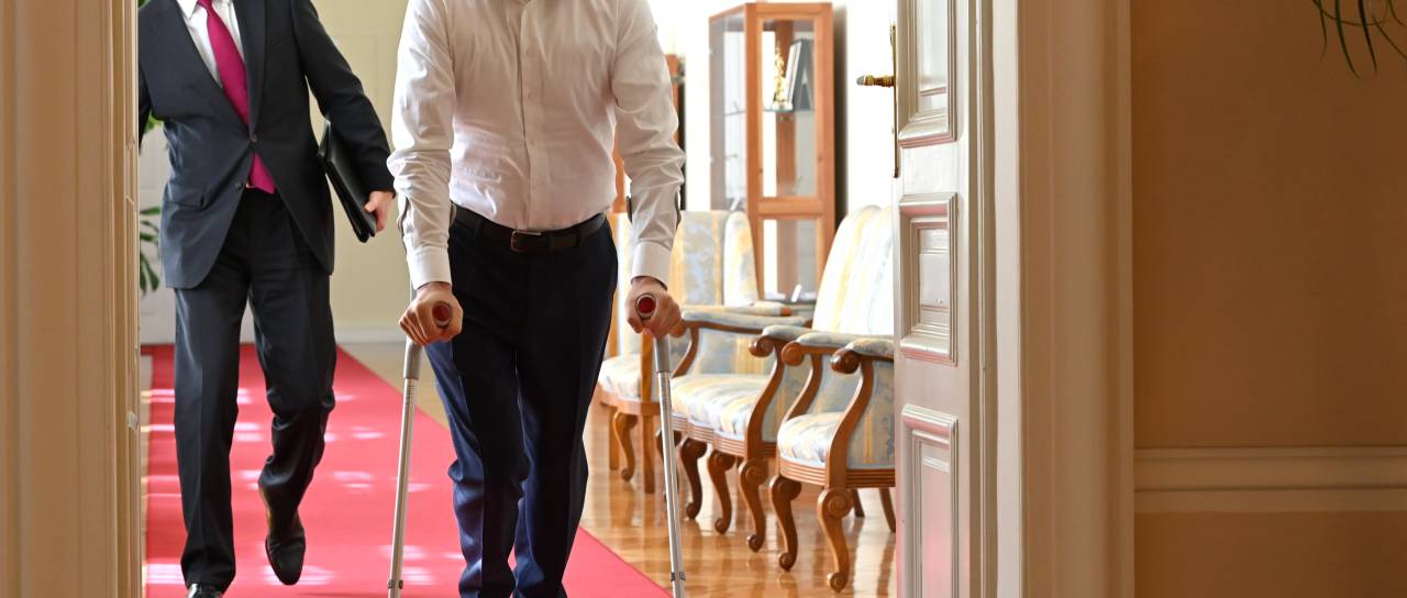 Precej pozornosti pa je pritegnil predvsem premier, ki je na sejo presenetljivo prišepal s pomočjo bergel, očitno je staknil resnejšo poškodbo desne noge.