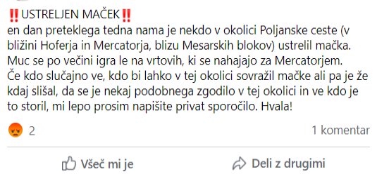 Veterinarka je ugotovila, da ima v zgornjem delu tačke metek. Lastnica mačka je na svojem Facebook profilu delila spodnji zapis, v katerem prosi za pomoč. Iščejo storilca, ki je v okolici Poljanske ceste, blizu Mesarskih blokov, ustrelil Živka. Ta se je rad sprehajal po vrtovih med njihovim in sosednjim blokom.