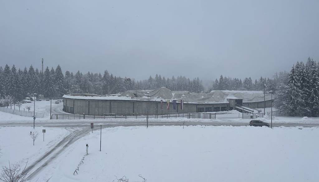 V noči na ponedeljek je v Novem mestu začelo obilno snežiti, zapadlo je okoli 40 centimetrov snega. Streha velodroma se je že od dopoldneva nagibala pod novozapadlim snegom, kasneje pa klonila pod težo snežne odeje.