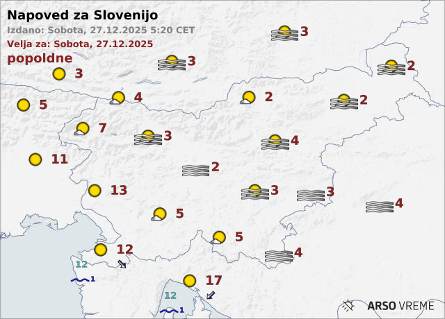 Najvišje dnevne temperature bodo v notranjosti države sicer med dve in pet stopinj Celzija, nekoliko topleje bo na Primorskem, kjer bo burja ponehala, temperature pa se bodo povzpele do okoli 13 stopinj.