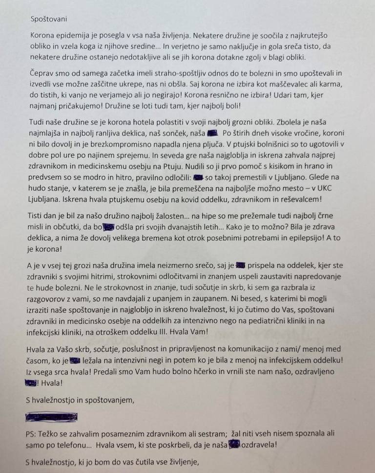 Ranljiva deklica, katere imena ne razkrijejo, je zbolela za koronavirusom. Ljubljanski zdravniki so jo rešili, to so pa hvaležne besede njenih staršev.