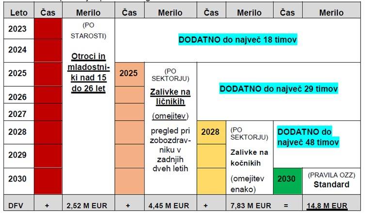 - V letih 2023 do 2024 se postopno opusti uporaba amalgama za zalivke pri mladostnikih nad 15 let in mlajših odraslih do 26. leta ne glede na njihov status. Skrajni rok za opustitev amalgama za zalivke pri mladostnikih nad 15 let in mlajših odraslih do 26. leta je 1. januar 2025.