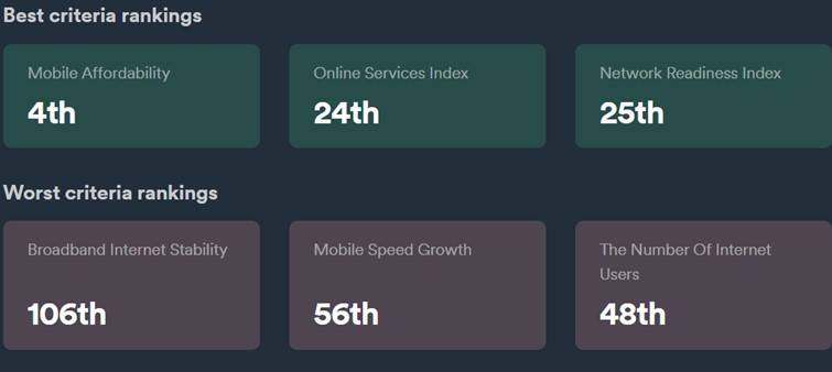 Najbolje se je Slovenija uvrstila v kategoriji, kjer so preverjali mobilno dostopnost. Med 110 državami smo v tej kategoriji dosegli kar četrto mesto. To pomeni, da imamo v svetovnem merilu enega najcenejših mobilnih internetov.