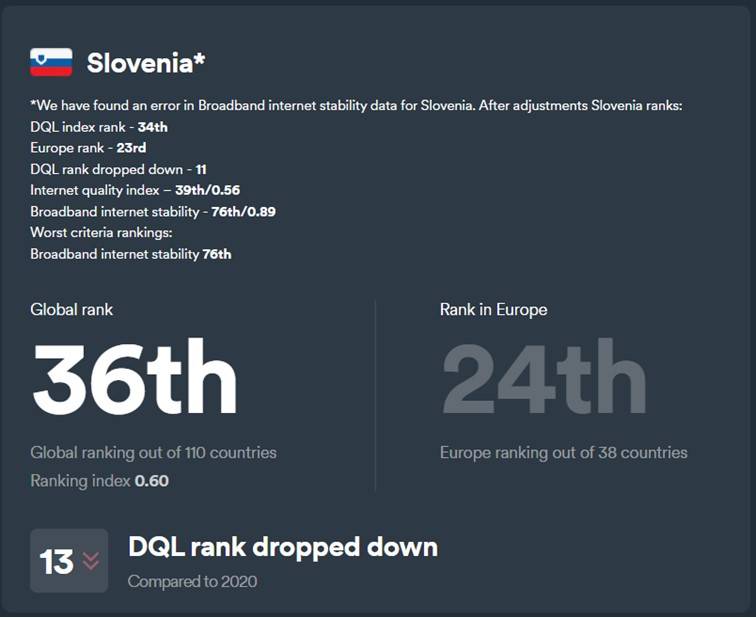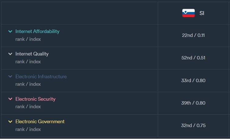 Indeks digitalne kakovosti življenja, ki preverja internetno dostopnost, kakovost interneta, elektronsko infrastrukturo, elektronsko varnost in e-upravo, se slabša, saj je Slovenija v primerjavi z lanskim letom, po lestvici zdrsnila za 11 mest.