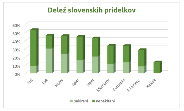 Ugotovili so, da je pri večjih trgovcih, kot so Hofer, Lidl, Spar in Mercator, več kot polovica pridelkov pakirana. Primer dobre prakse so trgovine Kalček, kjer je vso sadje in zelenjava nepakirano, manj kot tretjina ga je pakiranega še v trgovinah E.Leclerc.