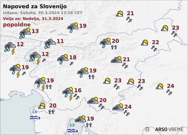 Najvišje dnevne temperature bodo od 16 do 24, na severozahodu okoli 12 stopinj Celzija.
