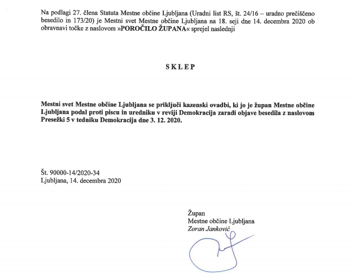 Na seji Mestnega sveta Mestne občine Ljubljana je župan Zoran Janković mestne svetnike in svetnice seznanil z vložitvijo kazenske ovadbe zoper Aleksandra Škorca in Jožeta Biščaka zaradi objave besedila z naslovom "Presežki 5".