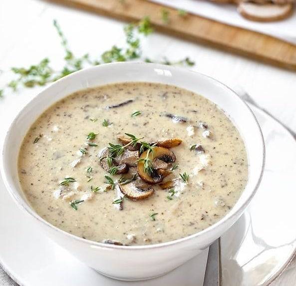 Priprava: Najprej očistimo gobe in jih narežemo na majhne koščke. Nasekljamo čebulo, zeleno, česen, peteršilj (tudi stebla) in osmukajmo timijan. V večjem lonecu na oljčnem olju prepražimo čebulo, zeleno, česen, stebla peteršilja, timijan in gobe. Posodo pokrijemo in dušite, da se sestavine zmehčajo. Nekaj gobic si iz lonca prestavimo v skodelico za pozneje. V lonec prilijemo še jušno osnovo in zavrimo, nato ogenj zmanjšamo in kuhamo še 15 minut. Solimo in popramo, nato pa juho zmiksamo s paličnim mešalnikom. Prilijemo še sladko smetano, ponovno zavremo, nato pa ugasnemo ogenj.