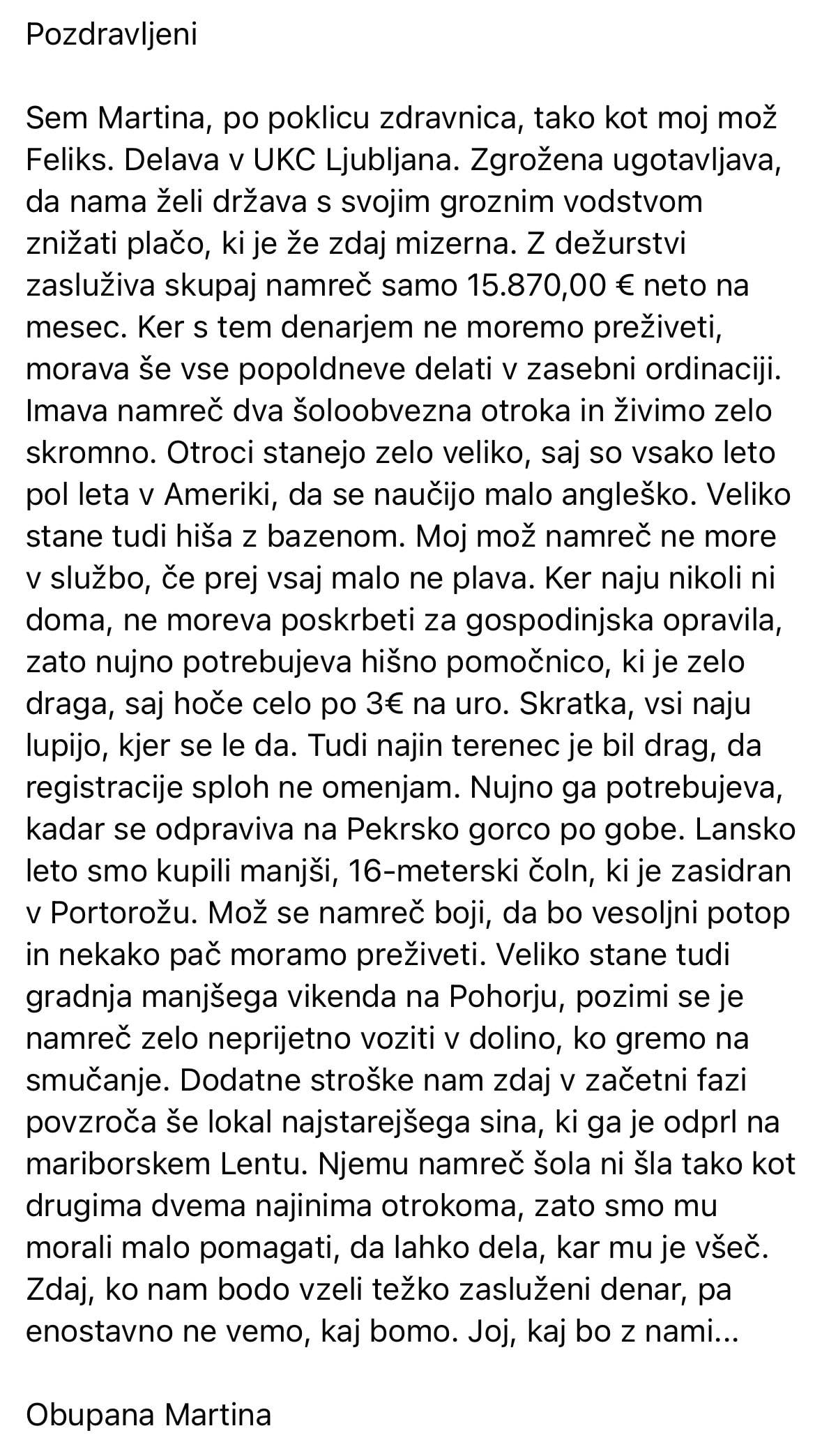 Gre za zapis 'zdravnice Martine', v zapisu pa navaja, da z možem za delo v Univerzitetnem kliničnem centru v Ljubljani prejemata mizerno plačo v višini slabih 16.000 evrov.