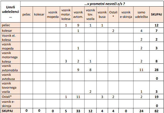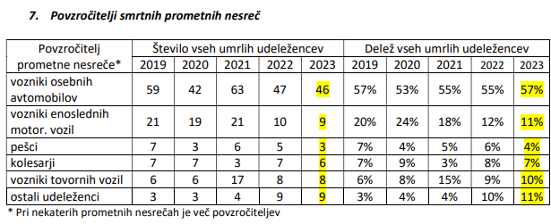 Zmanjšanje števila umrlih je tudi pri pešcih in kolesarjih, povečanje pa pri voznikih osebnih avtomobilov in potnikih.