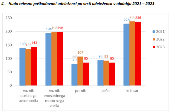 V preteklih treh letih je bilo največ hudo telesno poškodovanih udeležencev med kolesarji. V letu 2023 se je hudo telesno poškodovalo 236 kolesarjev oziroma za en odstotek manj kot v letu 2022.