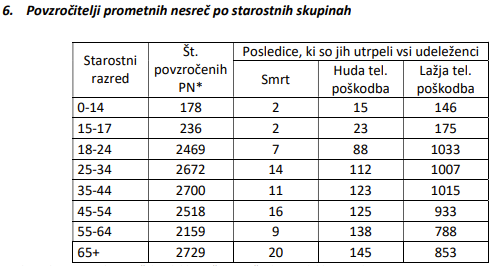 V letu 2023 je bilo največ umrlih udeležencev v prometnih nesrečah v starostni skupini nad 64. letom starosti, kar 31. Sledijo starostna skupina od 45. do 45. leta ter starostna skupina od 55. do 64. leta.