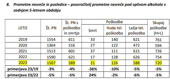 Povzročitelji prometnih nesreč pod vplivom alkohola so bili v letu 2023 odgovorni za 1507 prometnih nesreč, kar je manj kot v letu 2022 (1590).