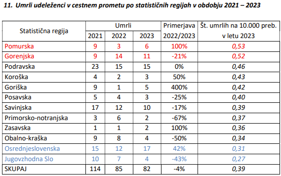 V primerjavi smrtnih žrtev po regijah najbolj negativno izstopata pomurska in gorenjska statistična regija, ki imata statistično 0,53 oziroma 0,52 umrlega na 10.000 prebivalcev. V pomurski statistični regiji je v letu 2023 umrlo šest udeležencev v prometu, v gorenjski pa 11.