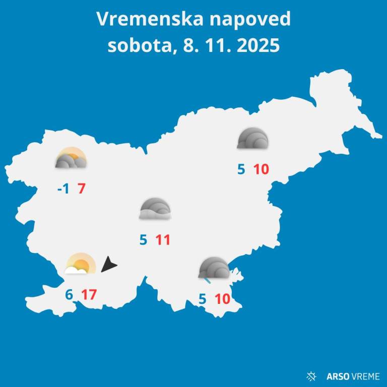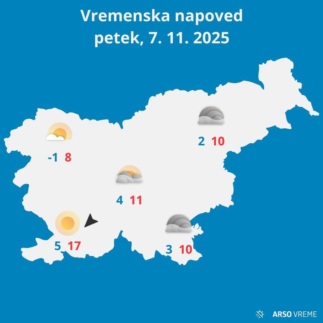 Najvišje dnevne temperature bodo od osem do 12, na Primorskem do 17 stopinj Celzija.