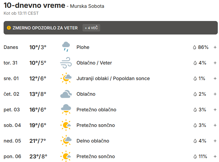 V Murski Soboti naj bi na veliko noč temperature dosegle okoli 21 stopinj Celzija, še topleje pa bo na velikonočni ponedeljek, ko se bo ogrelo do približno 23 stopinj Celzija.