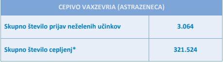 Cepljenje s cepivom AstraZeneca se je začelo v drugem tednu februarja. Na NIJZ je bilo v Register neželenih učinkov poročanih 3.064 primerov. V obdobju do 26. septembra je bilo v Sloveniji izvedenih najmanj 321.000 cepljenj s tem cepivom.